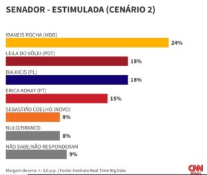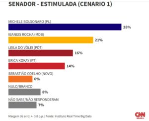 A ex-primeira-dama Michelle Bolsonaro (PL) e o governador Ibaneis Rocha (MDB) lideram os cenários para uma eventual disputa ao Senado pelo Distrito Federal, segundo pesquisa do instituto Real Time Big Data divulgada nesta terça-feira (9). Informações da CNN.